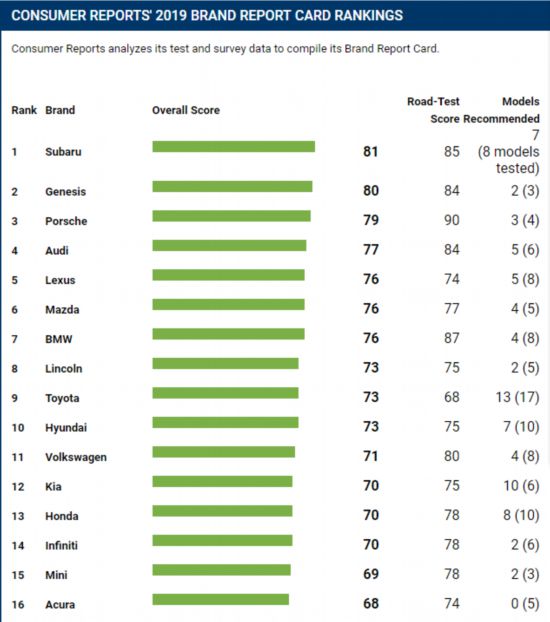 《消费者报告》的汽车测试高级主管Jack Fisher说:“最近斯巴鲁推出多款全新和改款车型,受到市场欢迎。要取得这样的效果并不容易。品牌对旗下汽车做出调整或发布新车时,其可靠性往往受到影响,在榜单中的排名会有所下降。但排名靠前的汽车品牌知道如何应对,这对消费者来说是好消息。”