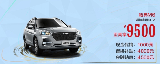 价格上来说,哈弗M6 6.6万元的起步价,相比吉利远景SUV、宝骏530便宜了近1万元,售价区间已完全近似于自主小型SUV的范畴。同时哈弗M6再放大招,自4月1日——5月31日,购车可享1000元现金优惠,4000元置换补贴以及4500元金融礼等多种优势金融方案,至高可享受9500元综合补贴。