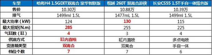 吉利缤越虽搭载1.5T涡轮增压发动机,也采用缸内直喷技术,但三缸发动机先天“瑟瑟发抖”的不足,还是会让很多消费者望而却步,即便实际使用中,并没有明显感觉。同时这款发动机所能带来的峰值扭矩为255 N·m,也比哈弗H4略低。而长安CS55搭载的1.5T发动机则采用多点电喷技术,比起缸内直喷来,少了几分底气,同时其115 KW的最大功率及225 N·m的峰值扭矩,也略逊于前两款。