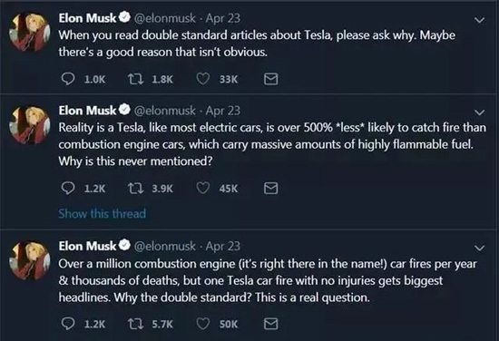 特斯拉CEO埃隆·马斯克还在社交平台上吐槽,“每年有超过100万辆汽油车发生火灾,导致数千人死亡,但为什么特斯拉起火却登上了头条?”