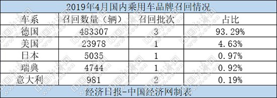根据国家市场监督管理总局缺陷产品管理中心4月份发布的召回公告,经济日报-中国经济网汽车频道经过汇总、统计,整理出“2019年4月国内乘用车召回榜单”。4月,国内乘用车市场共有7个品牌累计发布8起公告,召回汽车共计518045辆汽车,同比下降23.48%,环比增长63.89%。