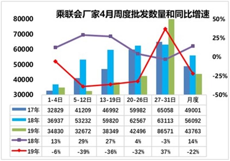 近日,乘联会发布了新一期周度车市解读,内容显示,据不完全统计的厂家零售数据,2019年4月零售销量为44,275辆,同比下滑18%;4月总体批发量达到日均4.38万台,相对18年4月同期销量下降22%。