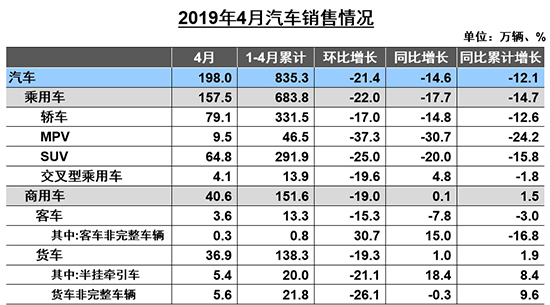 5月13日,中国汽车工业协会(以下简称“中汽协”)公布了4月我国汽车产销数据。4月,汽车行业整体下降趋势进一步扩大;综合1-4月数据,汽车产销降幅比1-3月再次扩大。车市下滑主要源于乘用车的弱势,而作为生产工具的商用车销量则保持平稳。