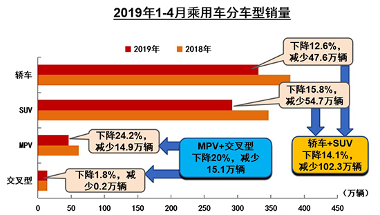 综合1-4月数据,乘用车共销售683.76万辆,同比下降14.65%,降幅比1-3月扩大0.93个百分点。其中,轿车累计销售331.46万辆,同比下降12.56%;SUV累计销售291.88万辆,同比下降15.77%;MPV累计销售46.49万辆,同比下降24.24%;交叉型乘用车销售13.94万辆,同比下降1.75%,其降幅继续呈现收窄态势。