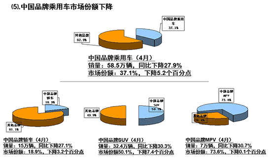 值得注意的是,分国别来看,自主品牌乘用车销量和市场份额都出现大幅下滑。4月,自主品牌乘用车共销售58.47万辆,环比下降29.83%,同比下降27.88%,占乘用车销售总量的37.13%,占有率比上月下降4.13个百分点。1-4月,自主品牌乘用车共销售277万辆,同比下降22.30%,占乘用车销售总量的40.51%,占有率比上年同期下降3.99个百分点。