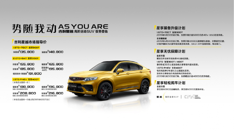 一款车的成功,除了车辆自身的硬实力足够之外,也少不了优秀的政策支持。为了让用户更轻松地拥抱星越所带来的高级出行生活,星越推出了“星享装备升级计划”:2019年6月30日之前订购 300T(即智擎1.5TD+7DCT)车型的所有用户,将获得价值6000元的48V BSG轻混系统的免费升级。2019年6月30日前订购全系耀星者的用户,免费升级价值12000元的星享娱乐装备,包含:全景星空天窗、12扬声器BOSE豪华高保真音响系统、GKUI APP远程控制与电动尾门。