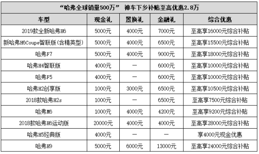 3月1日起,哈弗宣布正式启动“哈弗全球销量500万 神车下乡补贴至高2.8万”钜惠活动,这是继春节期间5亿红包感恩回馈活动之后,哈弗更大力度的感恩行动,优惠再升级,旨在让更多消费者底价购车,圆高品质SUV梦。