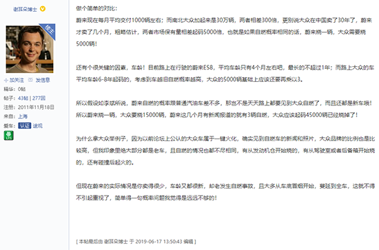 名为“谢耳朵博士”的网友,根据李斌对于蔚来自燃概率的表态,将蔚来与大众作比较,并进行了简单的计算。他表示:“蔚来现在每月平均交付1000辆左右;而南北大众加起来是30万辆,两者相差300倍,更别说大众在中国卖了30年了,蔚来才卖了几个月。粗略估计,两者市场保有量相差起码5000倍”,并得出了一个“夸张”的结论——如果自燃概率相同的话,蔚来烧1辆,大众需要烧5000辆!