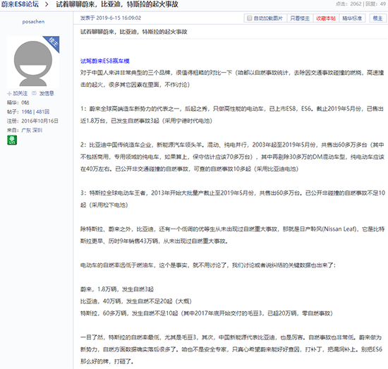 另一位网友“posachen”则针对几家电动车品牌的保有量和自燃事故数量作出横向对比。