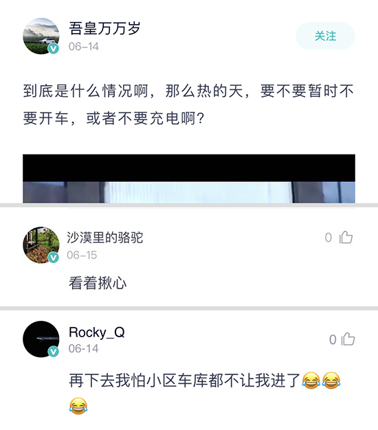 不安的情绪随着信息的传播迅速蔓延,“看着揪心”;“那么热的天,要不要暂时不要开车,或者不要充电啊?”;“再下去我怕小区车库都不让我进了”等声音此起彼伏。也有不少车主表示:“希望是车内有易燃易爆品引起的,静等官宣”。