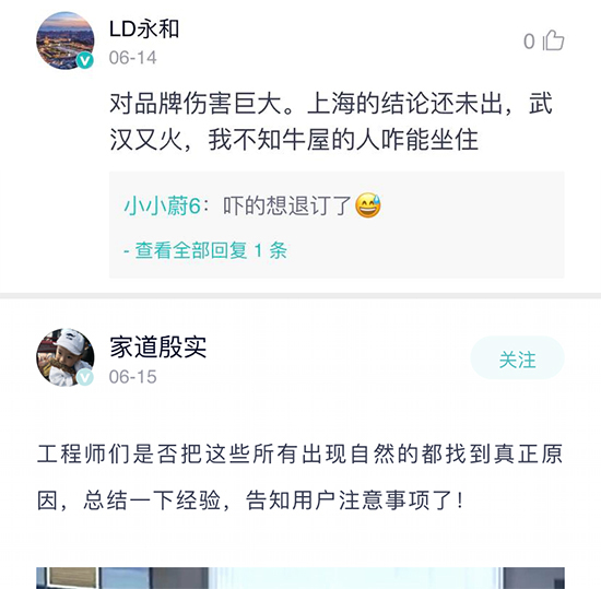另有不少车主在得知自燃事件后表示,此类事件“对品牌伤害巨大。上海的结论还未出,武汉又火,我不知道牛屋(NIO House)的人咋能坐住。”也有车主呼吁,“工程师们是否(应该)把这些所有出现自燃的都找到真正原因,总结一下经验,告知用户注意事项了!”