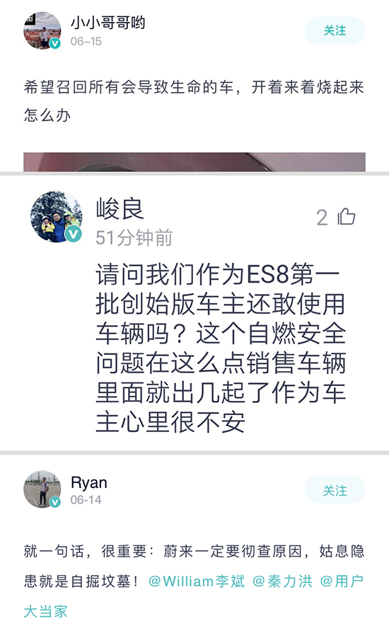 但更多的,则是对蔚来ES8如此高频次自燃的愤怒:“希望召回所有会导致(失去)生命的车,开着开着烧起来怎么办?”;“我们作为ES8第一批创始版车主还敢使用车辆吗?这个自燃安全问题在这么点销售车辆里面就出几起了,作为车主心里很不安。”;“蔚来一定要彻查原因,姑息隐患就是自掘坟墓!”并@了李斌、秦力宏等蔚来高管。