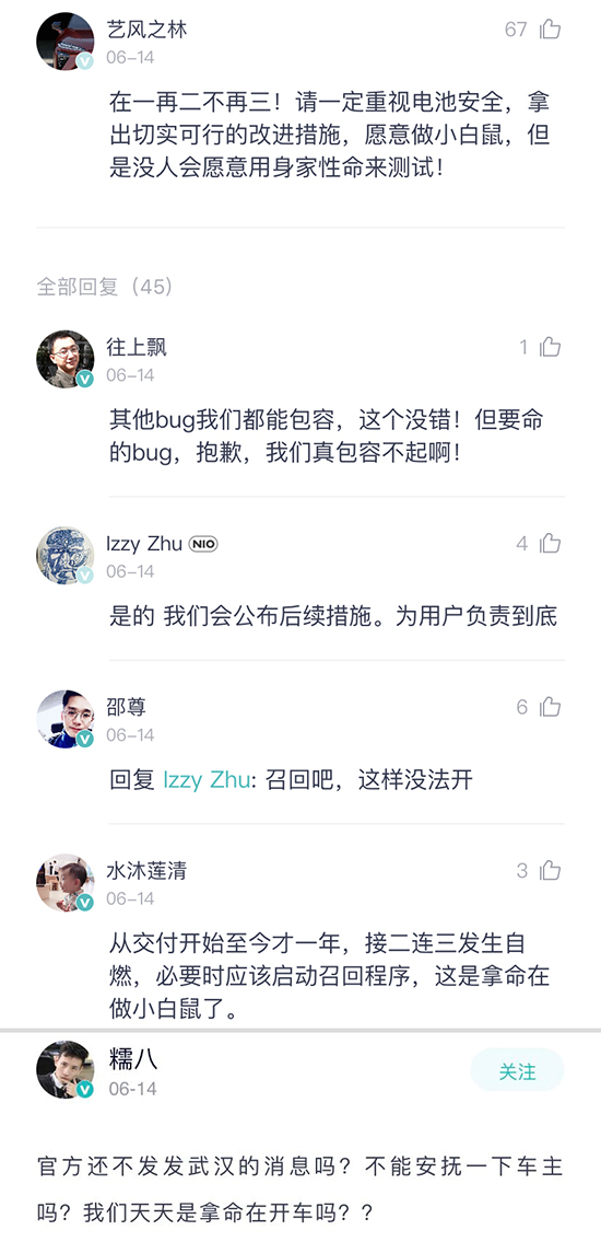 在蔚来官方“公布自燃事件的动态”后,有车主和准车主表示:“愿意做小白鼠,但是没人会愿意用身家性命来测试!”;以及“其他bug我们都能包容,但要命的bug,抱歉,我们真包容不起啊!” 更有车主表示,“我们天天是拿命在开车吗?”