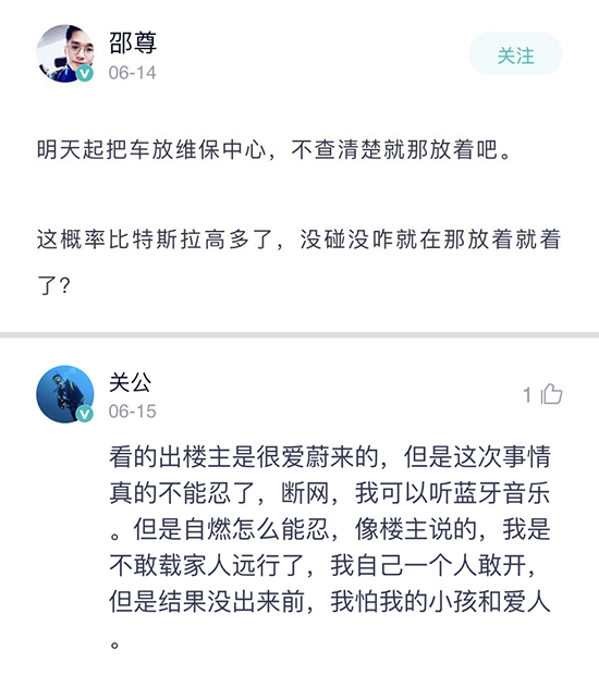 其他“急性子”的车主更为直接地表达了不满和抗议:“明天起把车放维保中心,不查清楚就那放着吧。”在该条状态下,有车主表示:“这次事情真的不能忍了……我是不敢载家人远行了,我自己一个人敢开,但是结果没出来之前,我怕我的小孩和爱人(出意外)。”