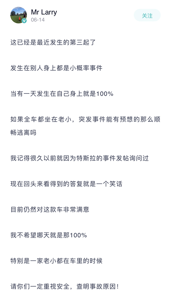 类似的还有:“发生在别人身上都是小概率事件,当有一天发生在自己身上就是100%……我不希望哪天就是那100%,特别是一家老小都在车里的时候。”并吁请蔚来官方一定要查明事故原因。