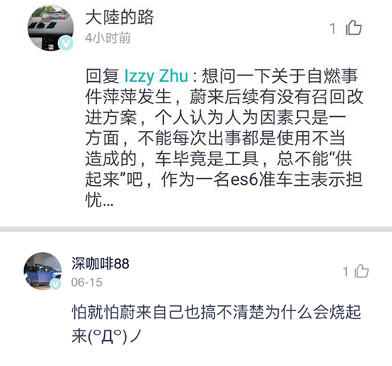 对于准车主而言,还要不要买蔚来产品则还需“三思”。“想问一下关于自燃事件萍萍(频频)发生,蔚来后续有没有召回改进方案……人为因素只是一方面,不能每次出事都是使用不当造成的,车毕竟是工具,总不能‘供起来’吧……”,以及“怕就怕在蔚来自己也搞不清楚为什么会烧起来。”