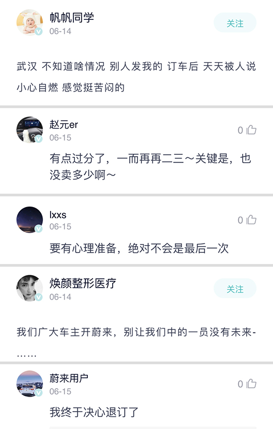 此外,还有诸如“订车后,天天被人说小心自燃,感觉挺苦闷的”;“有点过分了,一而再再而三,关键是也没卖多少啊……”;“要有心理准备,绝对不会是最后一次”;“我们广大车主开蔚来,别让我们中的一员没有未来……”,以及“终于下决心退订了”。(经济日报-中国经济网 记者张羽)