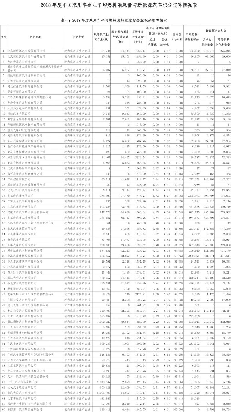 工信部发布2018年中国乘用车企业双积分情况