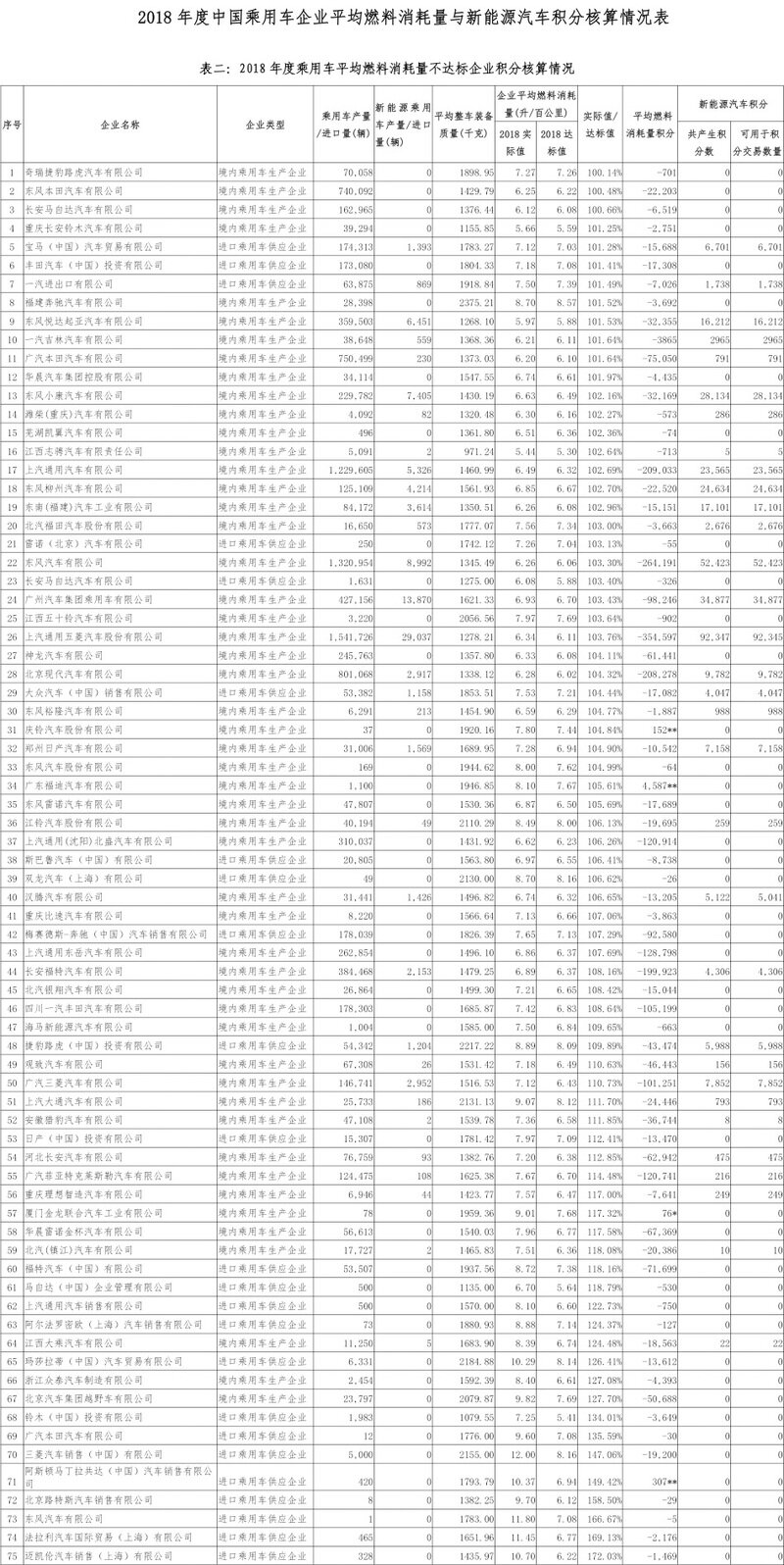 工信部发布的资料显示,在上述在141家境内乘用车企业中,企业平均燃油消耗量达标的共计66家,不达标的75家;而在112家境内乘用车生产企业中,平均燃油消耗量的实际值超出达标值的比例最高的三家企业分别为:北京汽车集团越野车有限公司、浙江众泰汽车制造有限公司,以及江西大乘汽车有限公司,其实际值与达标值的比值分别为127.70%、127.08%和124.48%;平均燃料消耗量负积分依次为50688分、4393分和18653分。