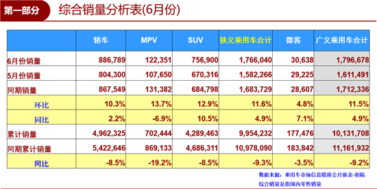 6月,轿车共销售886789辆,环比上涨10.3%,同比增长2.2%;1-6月,轿车累计售出4962325辆,同比下滑8.5%。而MPV车型则仍是“跌跌不休”,6月,MPV共售出122351辆,同比下滑6.9%,是三大车型中唯一下滑的车型;1-6月,MPV累计销售702444辆,下滑幅度达到19.2%。