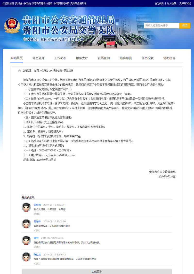 关于调整小型客车尾号限行规定的征求意见稿由贵阳市公安交通管理局于9月10日发布,意见反馈时间为2019年9月15日前。