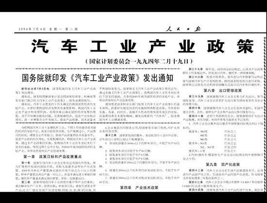 1994年,《汽车工业产业政策》发布,明确了以轿车为主的汽车发展方向,首次提出鼓励汽车消费,允许私人购车,并要求合资产品的国产化率要达到60%-80%。由此确立了“引进、消化、吸收”,促进国产化,培养自主发展的思路,提出“高起点、大批量、专业化”建设轿车产业的战略方针。自此,中国汽车工业的宏观发展方向确立。