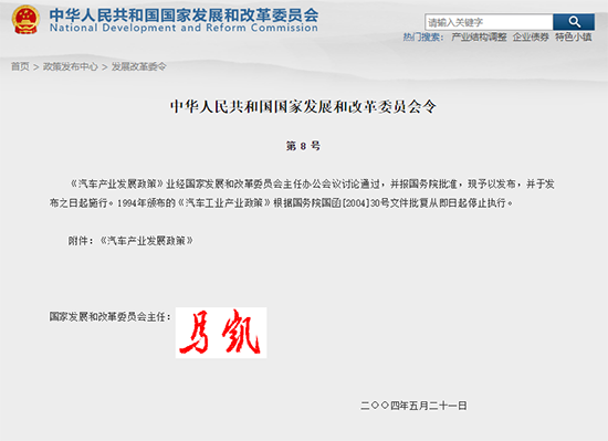 《政策》发布并执行十年后,基于世界汽车市场的格局变化和国内汽车产业在制造、消费等方面的新变化,中国政府及时制定并正式出台了《汽车产业发展政策》。“新政”最突出的特点是将对汽车生产企业投资项目的审批管理制度,更改为实行备案和核准两种方式——审批制度的取消,也标志着我国汽车行业管理模式从计划经济向市场经济的过渡。