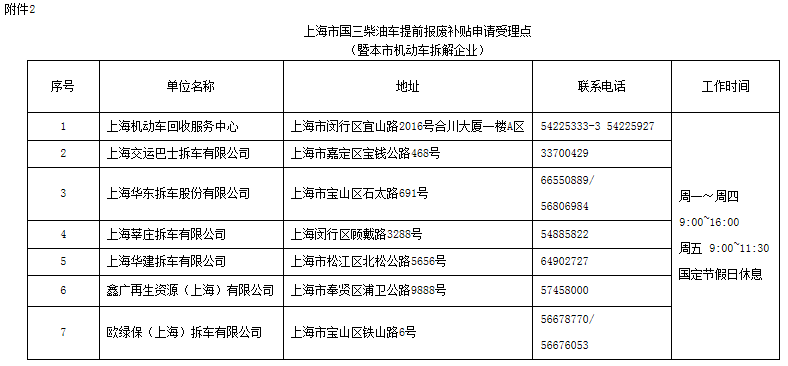 市生态环境局会同市商务委、市公安局、市财政局、市交通委指导第三方机构在本市各机动车拆解企业所在地设立“上海市国三柴油车提前报废补贴申请受理点”(见附件2)开展相关工作。
