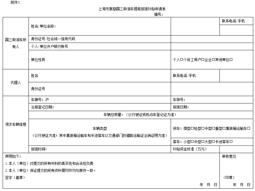 符合本办法补贴范围,需申请国三柴油车提前报废补贴的,车主应先将车辆交由本市机动车拆解企业(见附件2)办理报废手续,取得《上海市报废汽车回收证明》和《上海市机动车注销证明》后,向指定受理点提交《上海市鼓励国三柴油车提前报废补贴申请表》(见附件3)及其他申请材料。