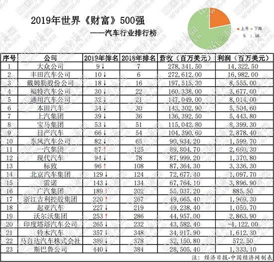 《财富》杂志正式发布2019“世界五百强”榜单。跻身其中的23位车企成员未变,但在排名上整体下滑,排名升降比为5:18。
