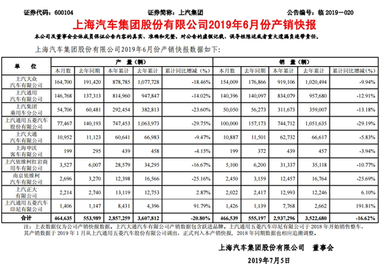 日前,上汽集团公布了2019年6月份产销快报。其中,上汽通用五菱继续维持暴跌走势,6月,其共销售汽车100000辆,同比下降36.38%;至此,上汽通用五菱已走出“十一连降”行情。尤其进入2019年,上汽通用五菱的累计降幅持续扩大,1-6月,其共销售汽车744712辆,同比大降29.19%。