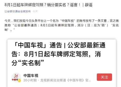8月起车牌绑定驾照销分要实名? 公安部交管局辟谣