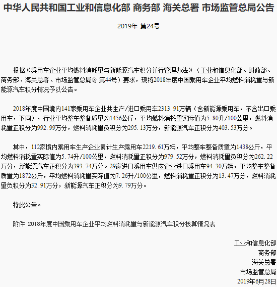 7月2日,工业和信息化部联合商务部、海关总署、市场监管总局就2018年度中国乘用车企业平均燃料消耗量与新能源汽车积分情况发布了公告。
