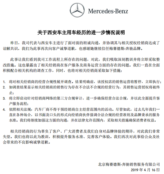 4月16日,北京梅赛德斯-奔驰销售服务有限公司发布声明称,针对西安车主用车经历的情况,北京奔驰将对相关经销商的经营合规性展开调查,结果明确前暂停其销售运营,并立即执行。