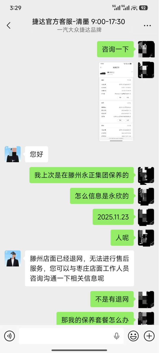 鲁网4月29日讯 “我当初就是认准了捷达的官方授权,才放心花5188元买了‘双保无忧’延保套餐,4S店于2024年底关了,厂家不管,保险公司也不给赔,花钱买的保障成了一张废纸。”近日,山东枣庄的捷达VS5车主刘先生(化名)向记者讲述了自己购买官方延保套餐却无法兑现的维权遭遇。